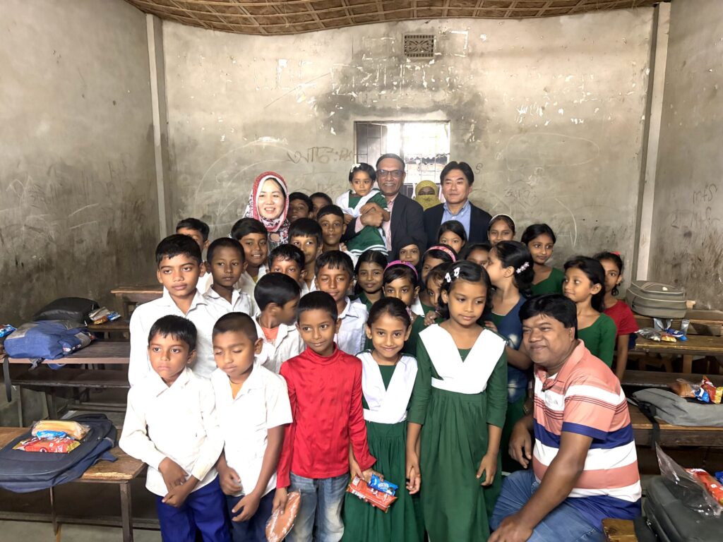 グループ企業(有)コスミックインフォリンクの自社工場で作った子供靴を近隣の小学校に寄付いたしました。 子供たちの喜ぶ顔がはじけ、日本とバングラデシュのかけはしになるという想いを一層強くいたしました。